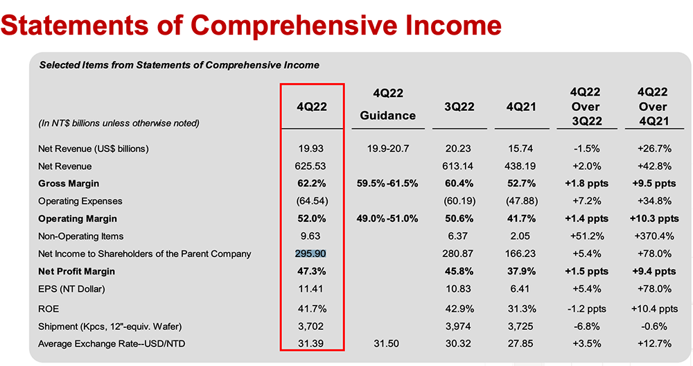 尽管整个芯片产业正被寒气侵袭,但台积电在第四季度的业绩表现依然强劲,收入、净利润、毛利率均创下历史新高。按新台币计,该季度其收入同比增长42.7%,净利润同比大涨78.0%。