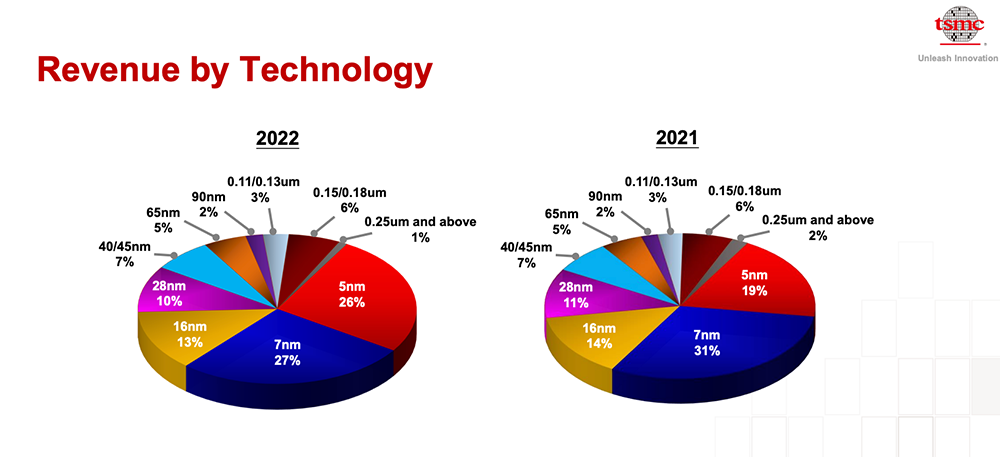 相较2021财年,台积电2022财年5nm收入占比进一步上升,从19%增至26%,7nm收入占比则下降4个百分点。