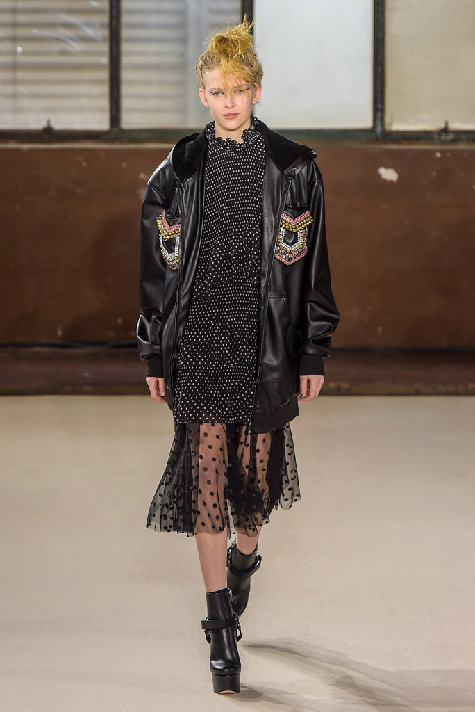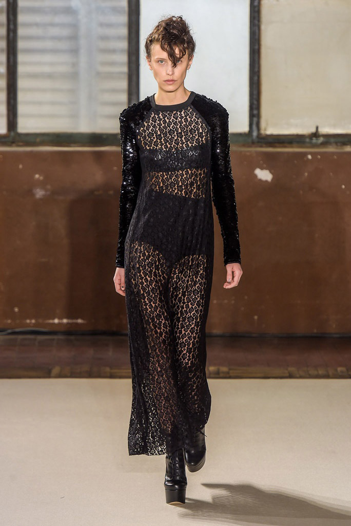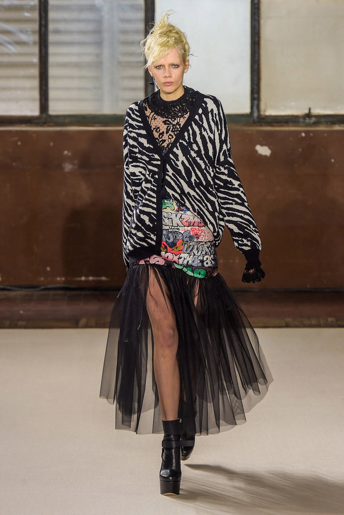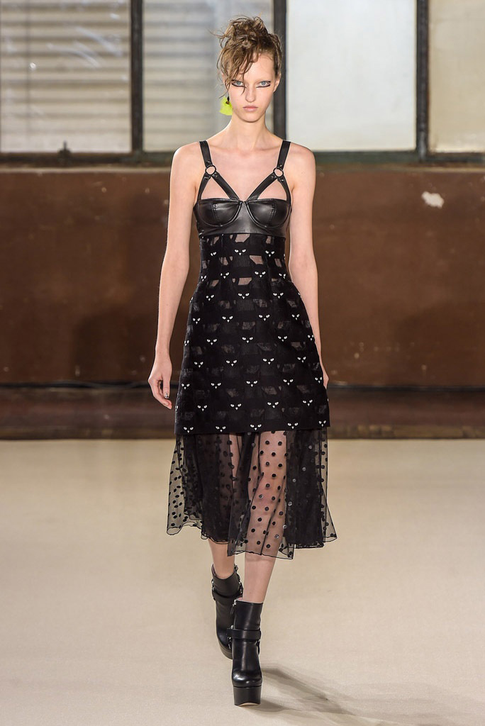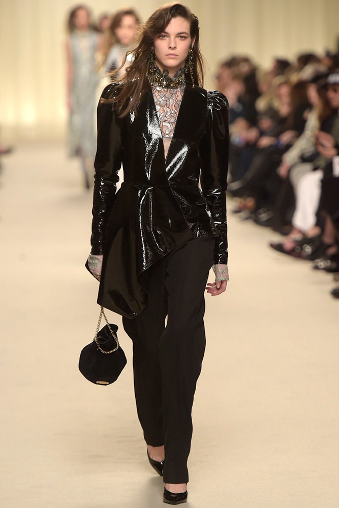 除了Marni之外,乍一看清新美好的还有Giamba,荷叶裙摆,细腻的蕾丝,但设计师Giambattista Valli想要表达的可不是这些,他想讲述的时刻,是1980年代的纽约地下俱乐部,暗黑、怪异、窒息,却无穷乐趣。同样是用妆容来配合服装,超高防水台的靴子是很大的一个噱头,暗示了这种地下俱乐部的危险之处。而虽然蕾丝被普遍应用,却不是我们日常印象中的粉红或粉黄色,搭配皮质的内衣裤,和加大的外套,黑白色系的运用为我们带来另一个视角的80年代。