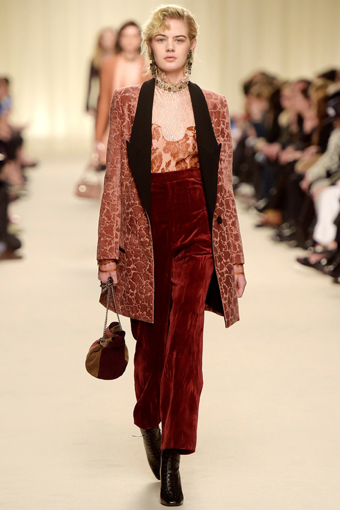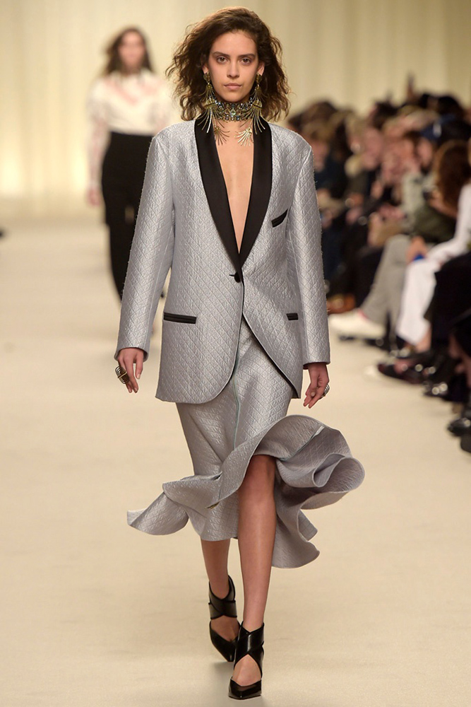 而在2016年秋冬季的秀场上,权力服饰普遍缩小了夸张的垫肩,在同样是大轮廓的基础上发掘更多元化的服装,加入了很多的女性味道,例如Vetements用连体袜和丝巾颈带来搭配西装、而lanvin加入了大鱼尾包臀,棕红色的植绒料子妩媚又帅气。