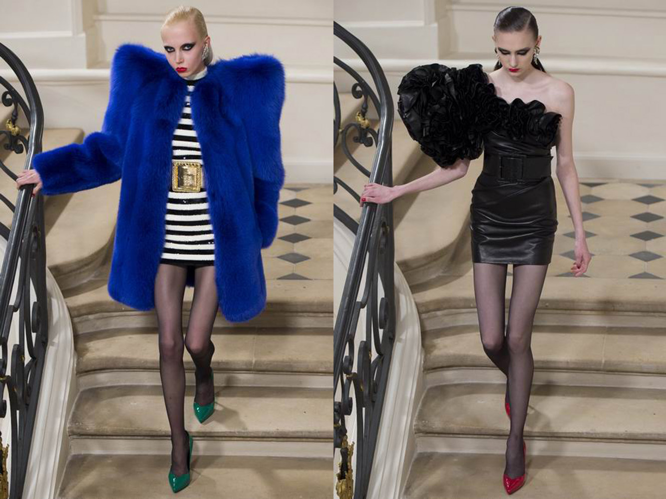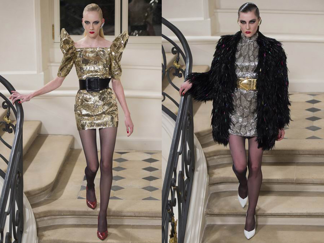 Saint Laurent似乎做得更加极致,关于80年代富家女的标配,肩上炸开来的装饰物,以及无限贴身显身材的礼裙,结合了所有的金属感和皮草,带来鼎盛的物质感。颇有点1980年代 Thierry Mugler(拥有无限华丽风格的服装设计师)的味道,“这是舞台上的狂欢”,当生活与舞台相互交融,你很难分得清楚哪个才是现实。蜂腰、垫肩,夸张的大装饰,再加上金灿灿的料子和浓郁的妆容,融合了时下设计师新加入的缎面和蕾丝等细腻的元素,“及时行乐”的80年代的精髓就算是抓到了。