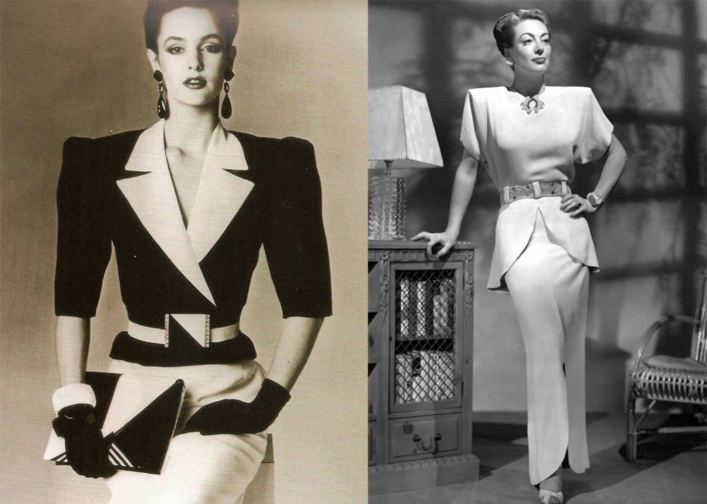 压轴的当然是1980年代的“权力服饰(power dressing)”,这发生在一个追求男女平等的时代。女性渴望像男士一样成为行政人员,且随着健康意识的提高,运动风潮的兴起,女士会去健身运动,保持更加美好的身段,对于可以凸显身材的衣服有了更高的追求。当然也对社会地位有了更大的渴望,男装女穿的权力服饰于同期横空出世,80年代的权力服饰最大的特点是宽阔、有垫肩、大件夹克(外套)、紧身半截裙等。不得不提的是强势廓形王Claude Montana,他的外套常是充满了垫肩,构成夸张的三角形轮廓。一定程度上与权力服饰的态度颇为吻合。与其他的设计师相比,他的设计没有那么多的过度装饰,尽管廓形夸张,但穿着的舒适度同样也叫人满足。