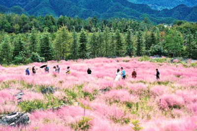 重庆酉阳县板溪镇叠石花谷景区内,游客在粉黛乱子草组成的粉色花海中游玩。新华社发