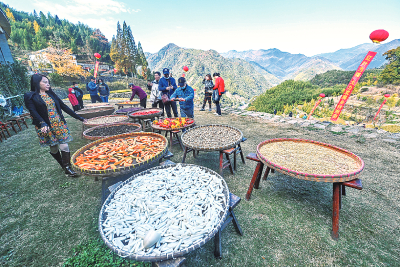 游客在浙江杭州市临安区太湖源镇指南村观赏晒秋的农作物。新华社发