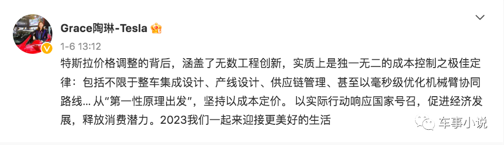 对于此轮大幅价格调整,特斯拉对外事务副总裁陶琳在其认证微博上发文称:“特斯拉价格调整的背后,涵盖了无数工程创新,实质上是独一无二的成本控制之极佳定律:包括不限于整车集成设计、产线设计、供应链管理、甚至以毫秒级优化机械臂协同路线… 从‘第一性原理出发’,坚持以成本定价。”
