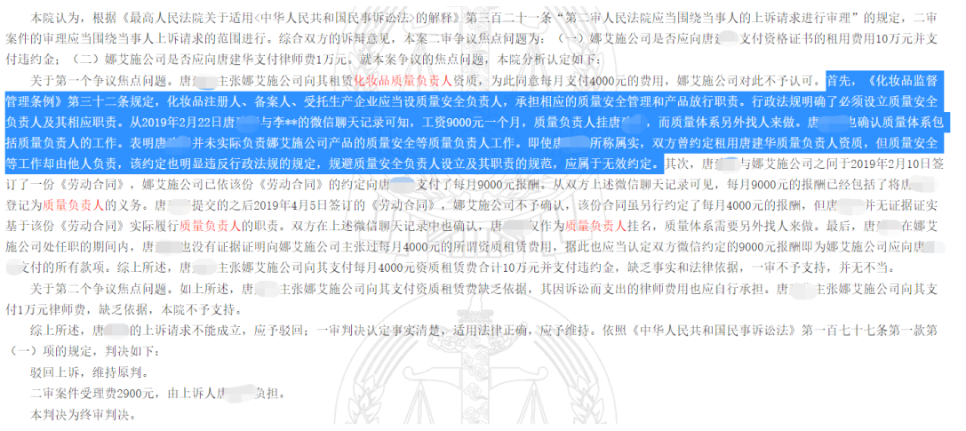 广东省广州市中级人民法院作出如此判决,主要有三大原因:首先,原、被告通过微信聊天确认每月9000元的报酬系包括了原告出借质量负责人资质的义务;其次,原告虽然提交了与被告签订的《劳动合同》,但是没有证据证明原告因该合同额外增加了工作量;而最重要的是,原告唐某仅作为质量负责人挂名,并未实际负责被告的产品质量,明显违反《化妆品监督管理条例》第三十二条的规定,即使双方存在相关的约定,亦属于无效约定。