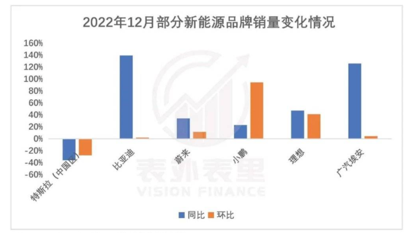 从国内新能源汽车市场的竞争看,行业正加速内卷。“蔚小理”、比亚迪之外,传统车企在新能源汽车布局也在2022年取得成效。吉利极氪、广汽埃安等传统车企旗下的新能源汽车品牌都已经成长为行业不可忽视的力量。2022年,广汽埃安交付量已经超过特斯拉中国的一半,但其仍然保持着100%的超高增速。