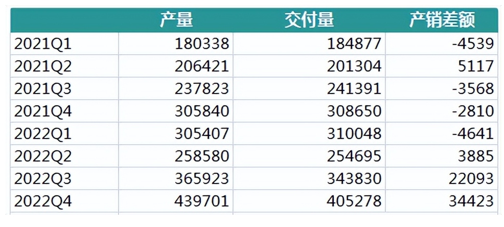 根据特斯拉官网数据,2022年二季度以前的大部分季度里,特斯拉产量高于交付量。但自从2022年二季度开始,特斯拉产量持续高于交付量,并且产销差额由二季度的3885辆扩大到4季度的3.4万辆。