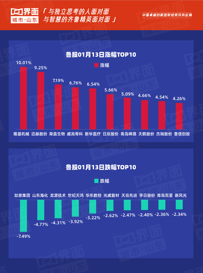 烟台市涨幅榜首:隆基机械(600777),涨幅10.01%,股价8.02元,总市值33.62亿元;