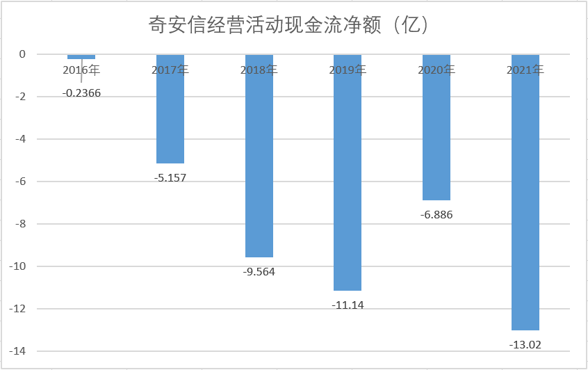那么,奇安信的经营现金流状况究竟如何?财报显示,自2016年以来,奇安信经营活动现金流净额就一直为负。截至2022年3季度,累计为-68,2亿元。