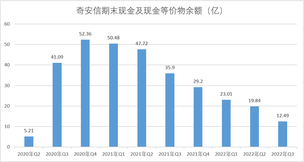 2020年7月,奇安信IPO净募资53.96亿元,到2022年6月底,募集资金余额仅为5.07亿元。而三季报显示,截至2022年三季度末,奇安信的现金及现金等价物仅剩12.49亿元,同比减少23.41亿,环比减少7.35亿。