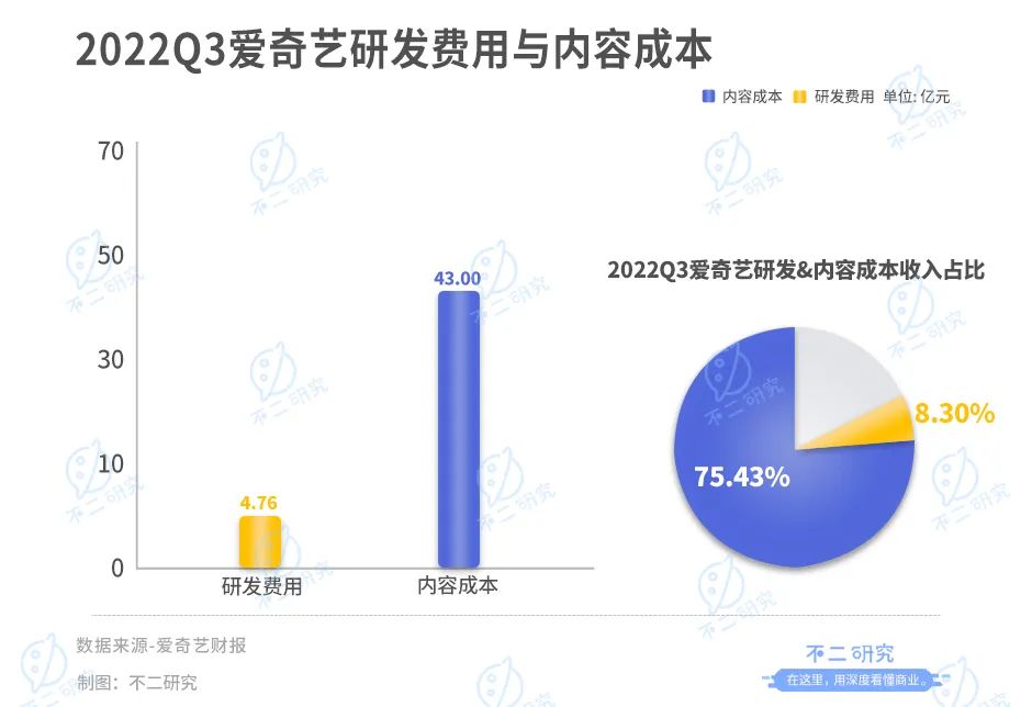 爱奇艺员工的相关工资、福利待遇的支出主要体现在研发费用科目。「不二研究」发现,今年三季度爱奇艺的收入成本为57亿元,其中爱奇艺的研发费用为4.76亿元,同比下降30%,在收入成本占比8.3%;而内容成本高达43亿元,在收入成本占比高达75.43%。