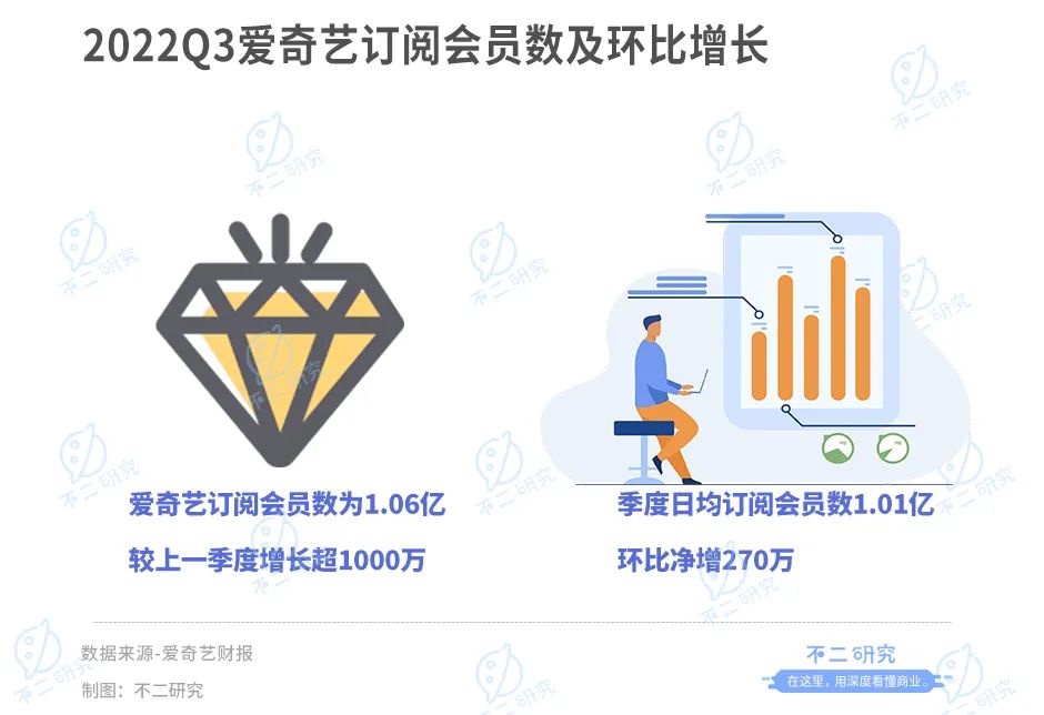 截止2022年9月30日,爱奇艺订阅会员数为1.06亿;较上一季度增长超1000万;季度日均订阅会员数1.01亿,环比净增270万。