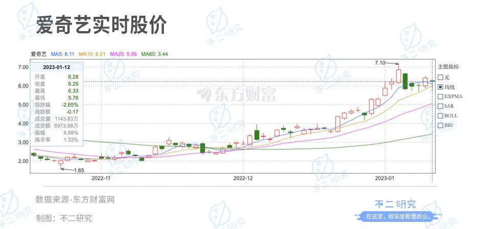 截止美东时间1月12日美股收盘,爱奇艺报收6.25美元/股,对应市值53.83亿美元(折合人民币362.30亿元)。对比“开门红”的高点7.10美元/股,市值已蒸发4.87亿美元(折合人民币32.71亿元)。