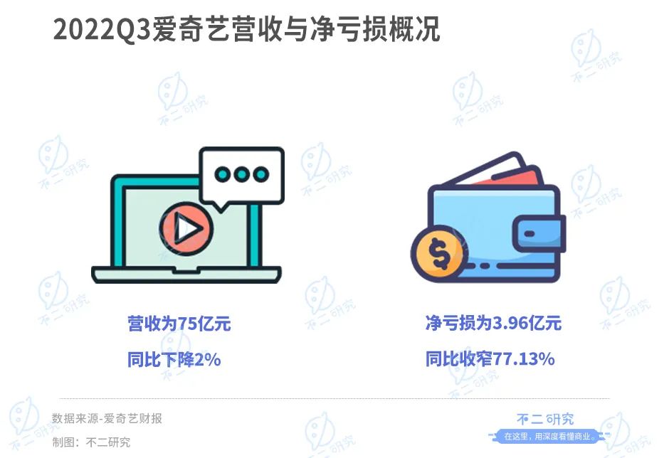 「不二研究」据其最新财报发现:去年三季度,爱奇艺营收75亿元,同比下降2%;同期,净亏损为1.87亿元,同比收窄77.13%。