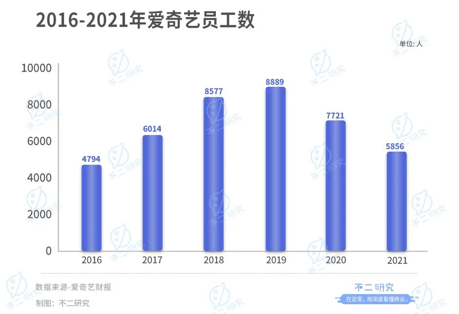 2019年是一个分界线,在此之前,爱奇艺的雇佣员工数一直处于增长状态;但从2020年末开始,其雇佣员工数逐年减少,截至2021年末,其雇佣员工数为5856人。
