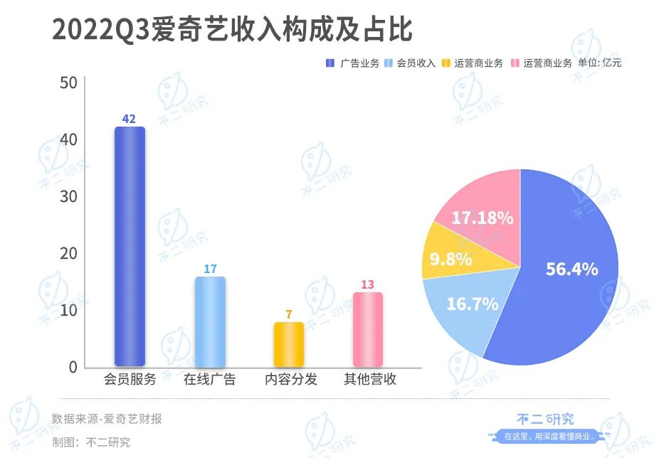 其中,会员服务营收为42亿元;在线广告服务营收为17亿元;内容分发营收7.30亿元;其他营收为12.84亿元。