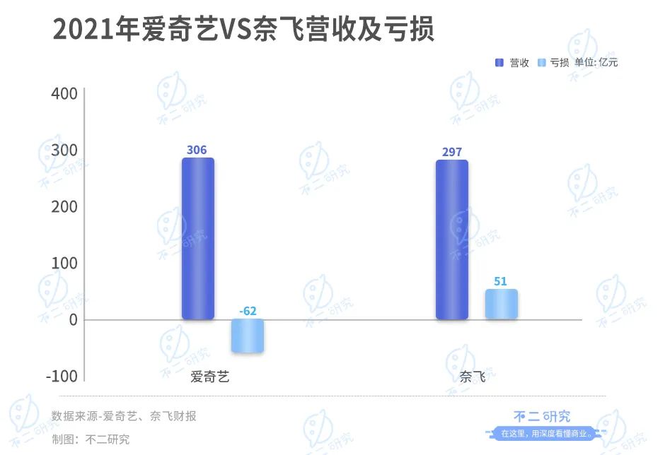 爱奇艺2021年营收306亿美元,净亏损62亿美元;对比奈飞,其2021年营收297亿美元,营业利润51亿美元。