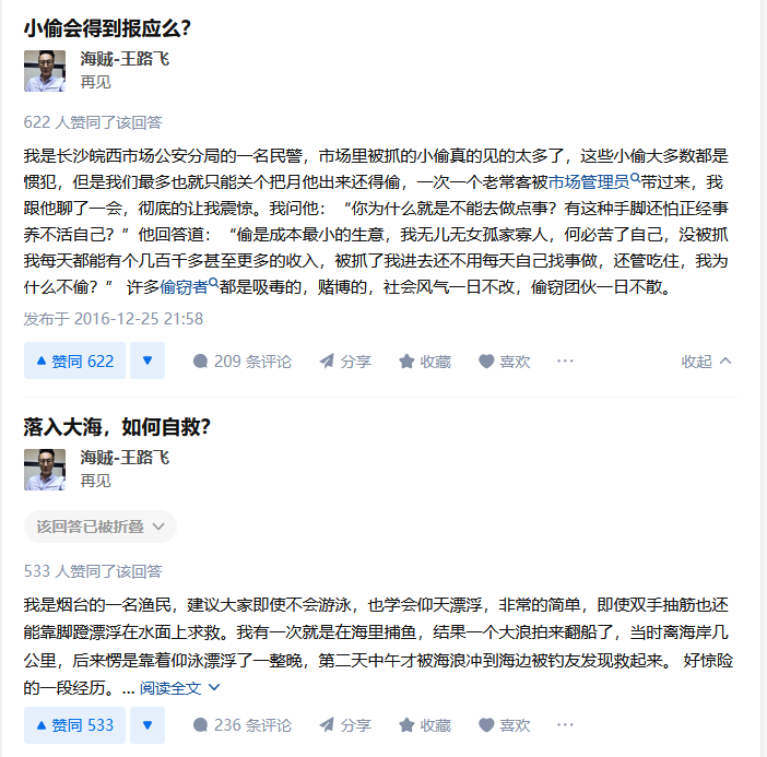 其中最会编的一位答主,名叫“海贼-王路飞”,编故事的能力令人叹为观止。他一共回答过244个问题,体验过国务院领导的秘书、星探、伞兵等100多种传奇人生。