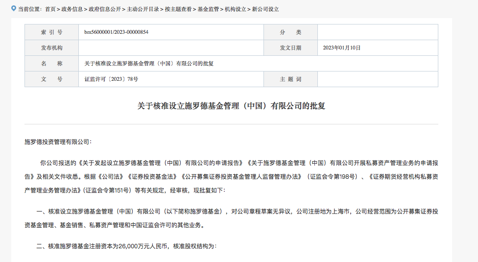 1月13日,证监会网站发布《关于核准设立施罗德基金管理(中国)有限公司的批复》,正式核准设立施罗德基金管理(中国)有限公司(下称施罗德基金),这也是施罗德投资集团在中国开展业务的又一重要里程碑。此前,施罗德交银理财有限公司于2022年1月获得监管的开业批准,并于2月获得营业执照。