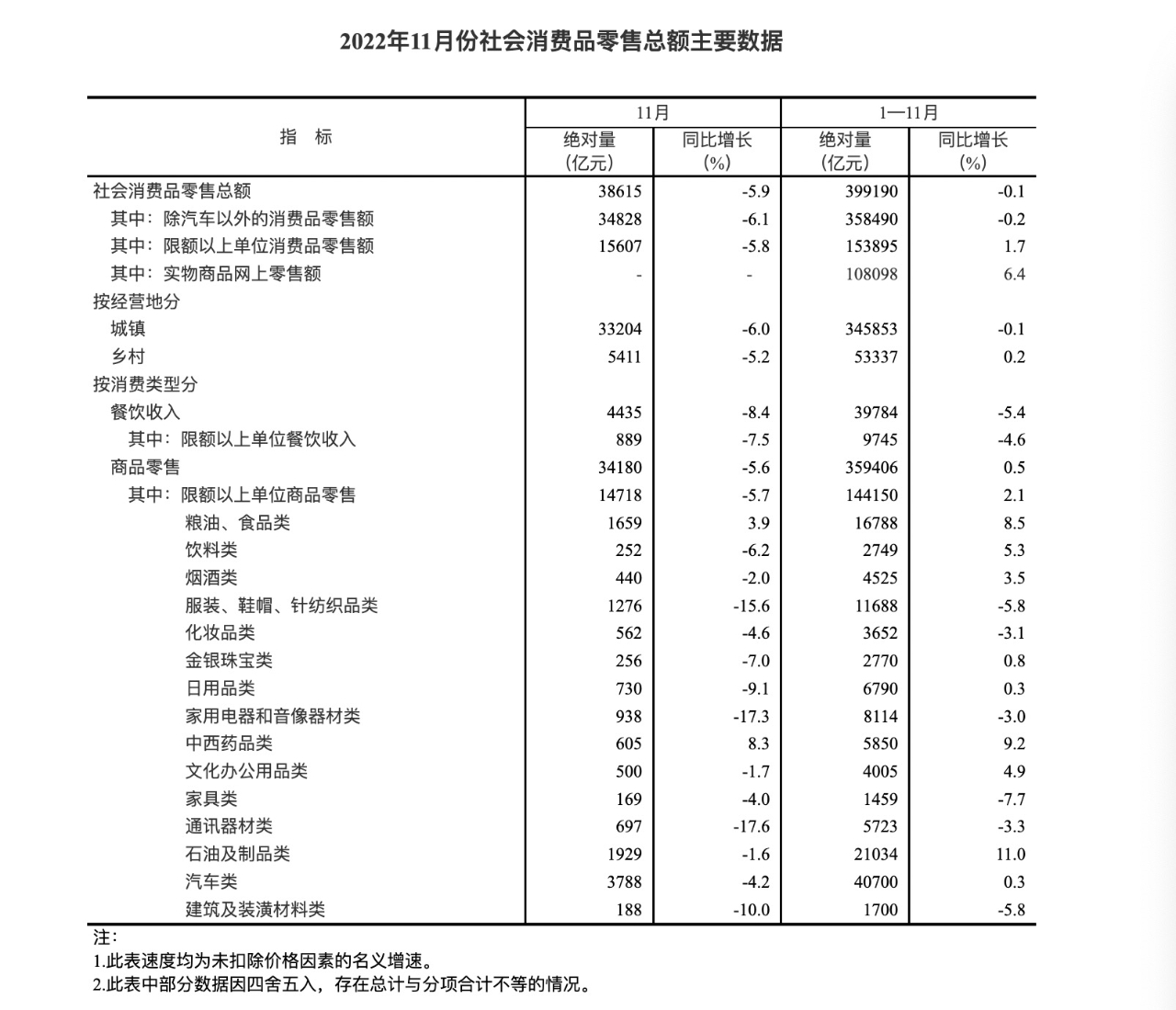 国家统计局数据显示,2022年1月至11月,化妆品零售总额为3652亿元,同比下滑3.1%。单独看11月,化妆品零售总额为562亿元,同比下滑4.6%。