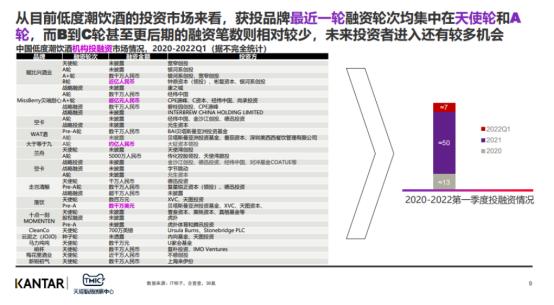 据天猫新品创新中心统计,2021至2022第一季度,低度潮饮市场的融资共50余起,近两年市场的融资轮次集中在天使轮和A轮,其中包括Miss Berry贝瑞甜心、兰舟、落饮、JOJO气泡酒、空卡等等,投资方包括复星、字节跳动、腾讯、经纬中国等知名资本。