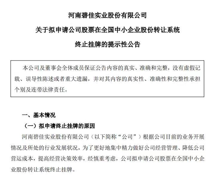 昨日(11月13日),河南碧佳实业股份有限公司(以下简称“碧佳实业”)发布公告称,公司拟申请公司股票在全国中小企业股份转让系统终止挂牌。