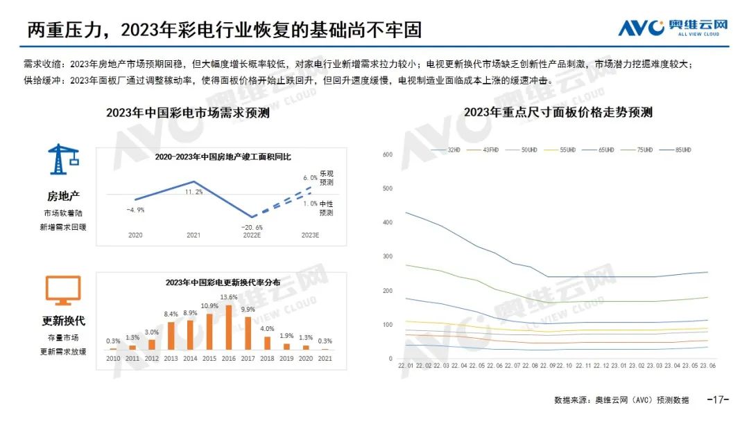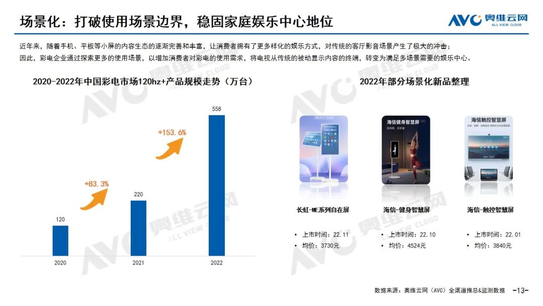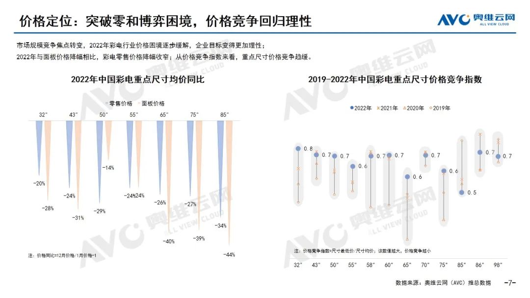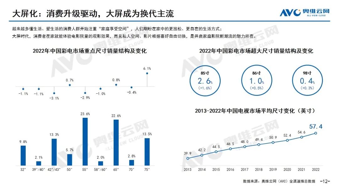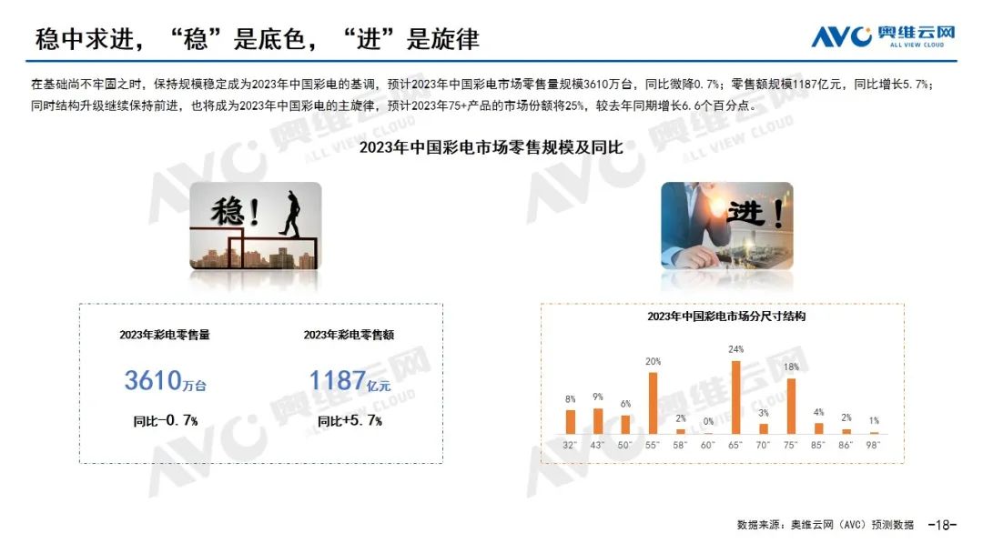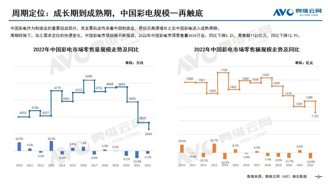 据奥维云网(AVC)全渠道推总数据显示,2022年中国彩电市场零售量规模为3634万台,同比下降5.2%,零售额规模为1123亿元,同比下降12.9%。中国彩电行业想要突破增长困局,需要从内卷竞争回归到内核竞争,即找准行业定位、找准目标市场、找准营销方式。
