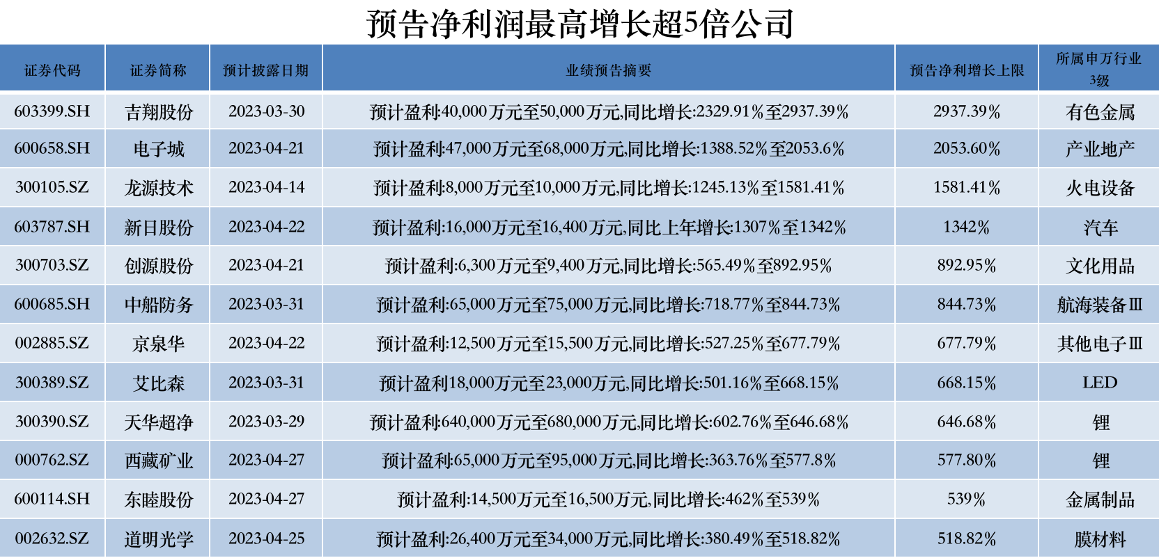 12家公司净利预增超5倍,吉翔股份超29倍增幅暂居第一