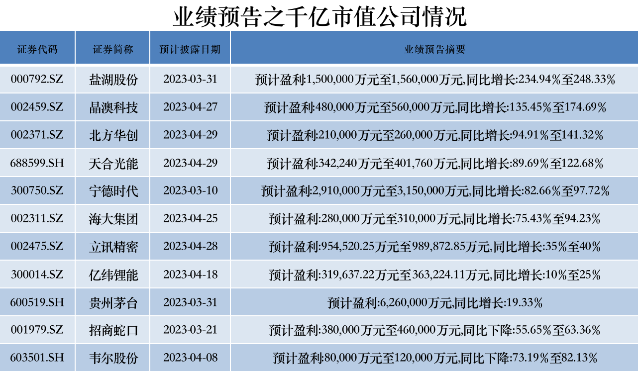 有11家千亿市值公司已披露年报预告,包括贵州茅台(600519.SH)、宁德时代(300750.SZ)2家万亿市值级别公司、半导体龙头中芯国际(002371.SZ)、消费电子巨头立讯精密(002475.SZ)、锂电龙头亿纬锂能(300014.SZ)等。