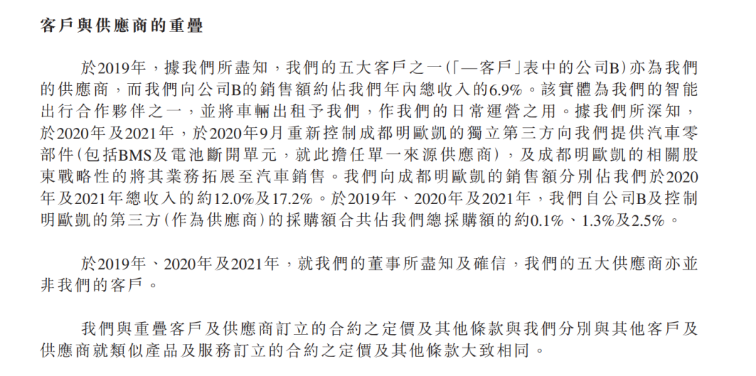 2019年,威马汽车的五大客户之一B公司亦为其供应商,销售额约占威马年内总收入的6.9%。同时,B公司还是威马汽车的智能出行合作伙伴之一,并将车辆出租给威马,作公司的日常运营之用。