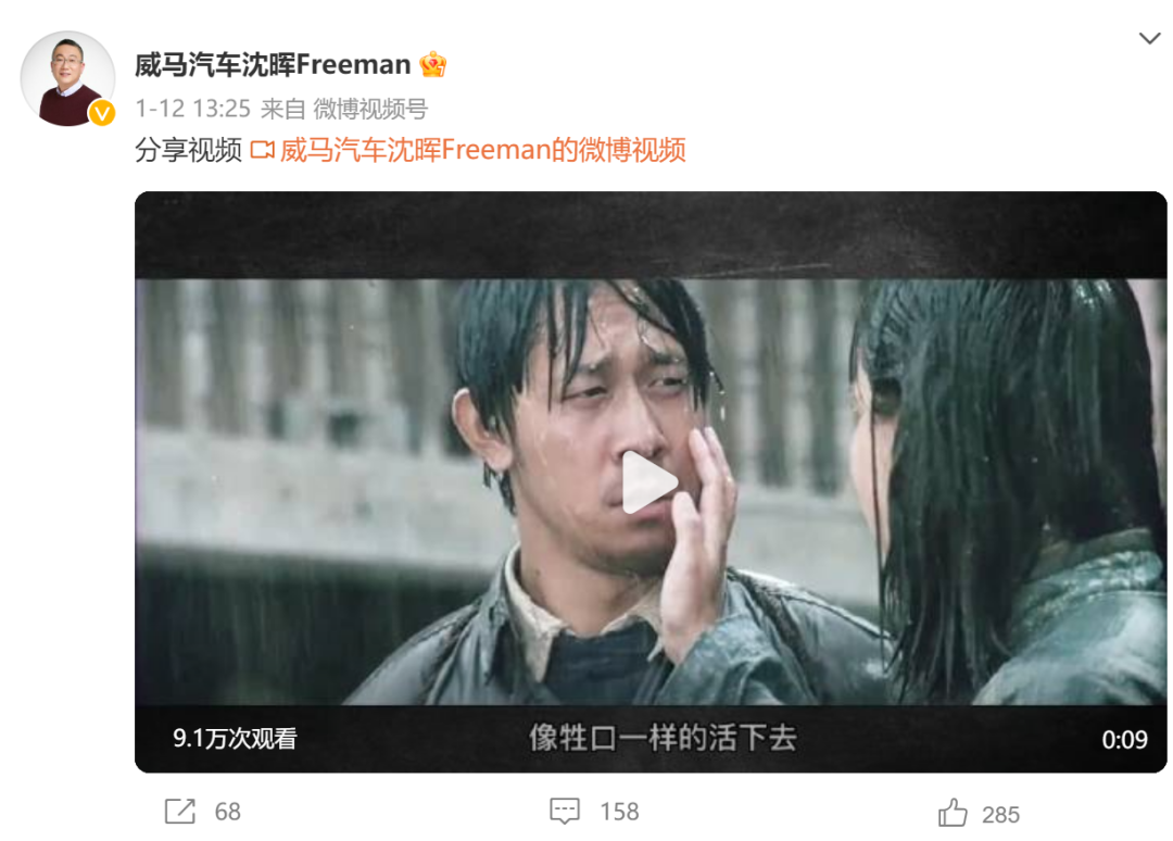威马创始人沈晖当日在微博发布了电影《芙蓉镇》的一段经典对白:“活下去,像牲口一样的活下去。”
