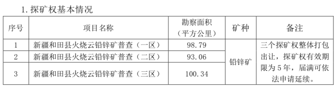 早在12月15日,自然资源部官网发布新疆和田县火烧云铅锌矿探矿权出让招标公告,公告显示,拟出让年限为5年,起始价为223亿元,保证金为4亿元。截止到目前,这是国内探矿权出让标的最高的项目。