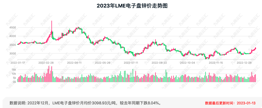 不过,紫金矿业在公告中也提示道,“火烧云铅锌矿权益金及后续投资金额大,对公司将产生较大资金压力;矿区位于人烟稀少的高海拔高寒地区,基础设施差,将给项目的开发建设带来严峻挑战。公司参与本次竞拍能否成功存在不确定性。” 锌是重要的有色金属原材料,在有色金属的消费中,锌仅次于铜和铝。广泛用于汽车制造、建筑、船舶、轻工,以及用于制造干电池等。“锌云汇”网站显示,截至2023年1月13日,锌价为3320元/吨,去年同期为3561.5元/吨,下降了7.27%。