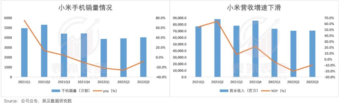 如下图,2021Q2开始,小米的手机销量增速和营收增速,双双持续下滑,并相继呈现负增长。