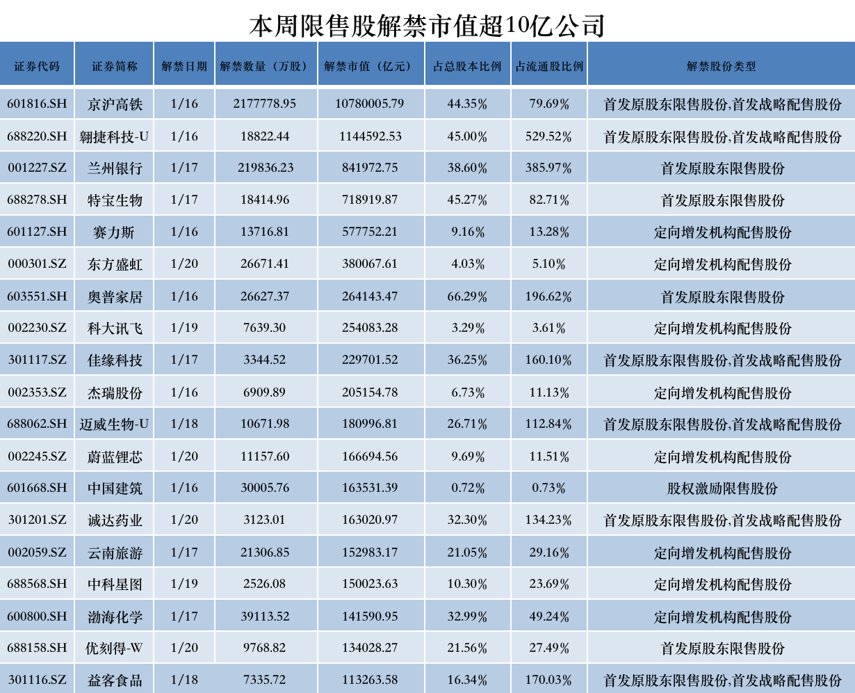 本周解禁市值超过10亿元的公司共19家,解禁规模最大的当属京沪高铁(601816.SH),解禁市值达千亿;其次是翱捷科技-U(688220.SH)解禁规模超100亿;此外,兰州银行(001227.SZ)、特宝生物(688278.SH)、赛力斯(601127.SH)解禁市值均在50亿元以上。