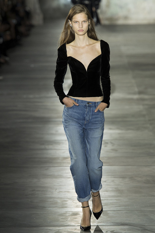 刚刚上任后的他推出了一组背景干净的人像特写照,片子里的模特几乎都没穿衣服,或是仅仅只穿了一条牛仔裤。他希望借助这张犹如白纸的广告片去宣告一段新的开始。而那条牛仔裤也不仅仅是因为他的个人喜好,而是为了契合当年Yves Saint Laurent本人说过的那句“我希望我可以是那个发明牛仔裤的人”。
