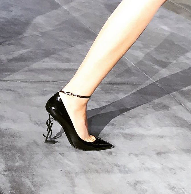 这种略显锋利,甚至是带有一丝挑衅的性感设计倒是秉承了设计师的私人爱好。尤其是Binx Walton身上的那件mono-boob皮裙成为引爆了社交媒体。有趣的设计还有新款鞋履,品牌logo“YSL”成为了高跟鞋的鞋跟。对于这些logo具有强大商业价值的奢侈品牌,在logo崇拜主义重新被点燃的当下,如何巧妙地将其运用在配饰产品设计中对设计师来说也是一项挑战。