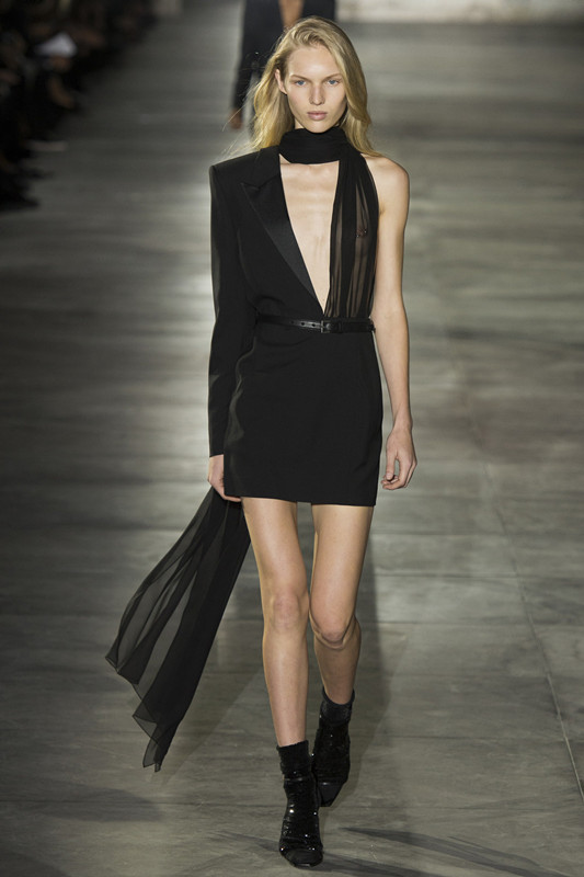 整个系列的确有着鲜明的1980年代风格——大垫肩。出乎意料的是Anthony Vaccarello并没有将自己同名品牌中的核心元素,高开叉运用到Saint Laurent中,除了改良款的吸烟装和牛仔裤,模特们几乎都是清一色的迷你短裙,并且绝大部分都是抹胸款或是露肩款。