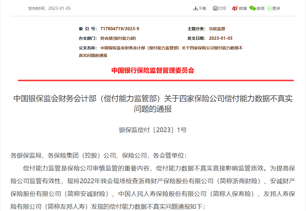 监管部门表示,偿付能力监管是保险公司审慎监管的重要内容,偿付能力数据不真实将直接影响监管质效。通报显示,监管部门在2022年偿付能力真实性检查中,发现浙商财险、安诚财险、人保寿险和友邦人寿4家保险公司存在偿付能力数据不真实问题。
