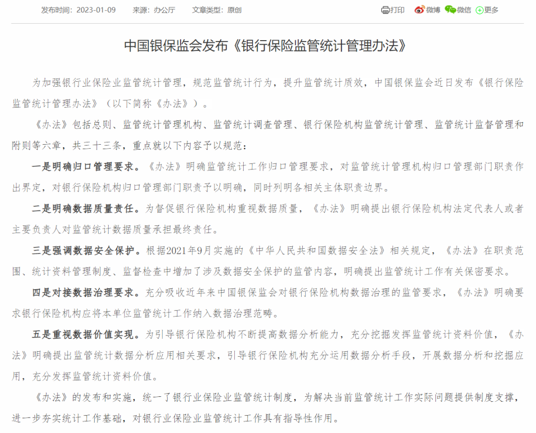 随后,2023年1月9日,为加强银行业保险业监管统计管理,规范监管统计行为,提升监管统计质效,中国银保监会发布了《银行保险监管统计管理办法》共六章三十三条,其中重点内容包括明确数据质量责任、对接数据治理要求以及重视数据价值实现等。