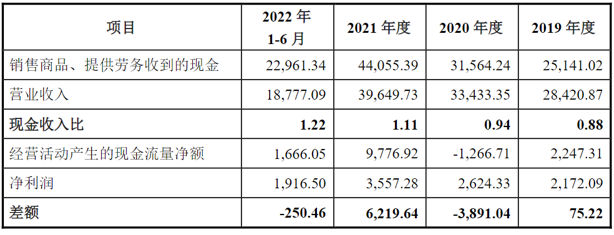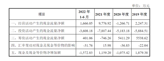 从现金流看,中润光学的现金及现金等价物净增加额,分别在2020年和2022年上半年出现了负数。虽然现金收入比变化不大甚至有所改善,但相对高额的资本开支,仍然力有不逮。
