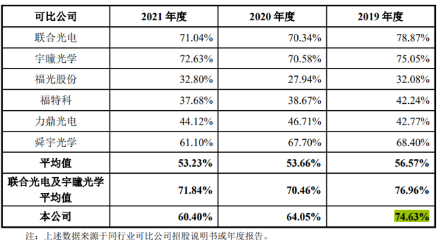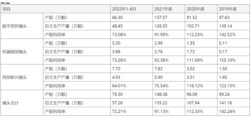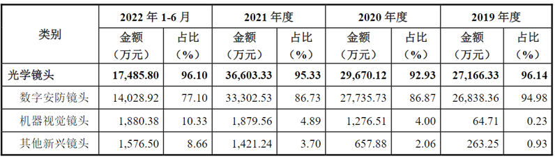 2019年至2022年上半年,光学镜头营收分别为2.72亿元、2.97亿元,3.66亿元和1.75亿元,占营业收入的比例一直在93%以上。
