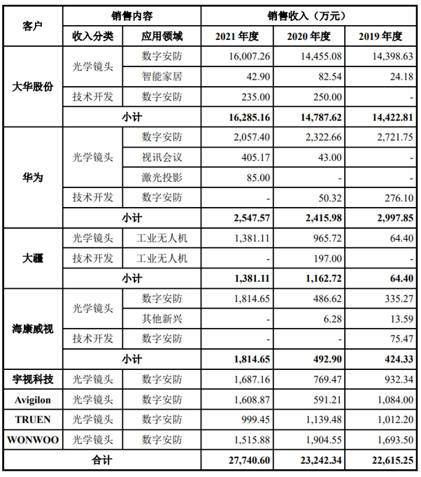 2019年-2021年,中润光学第一大客户大华股份,销售金额占营业收入的比例分别为50.75%、44.23%和41.07%。