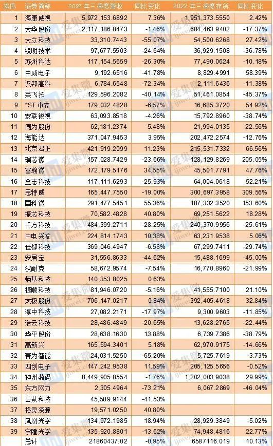 爱集微统计的39家安防企业中,除云从科技(688327.SH)等三家新上市公司外,前三季度存货价值合计7.49亿元,同比上涨22.77%。