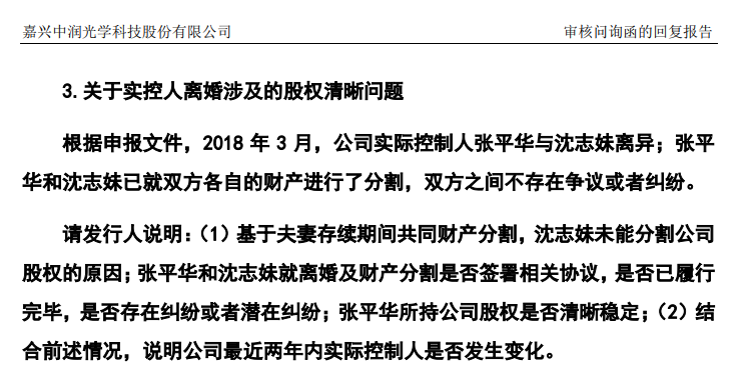 这不是第一桩上市公司于IPO前夕离婚的事件。之所以引发上交所的关注,是因为实控人在IPO前夕离婚,往往会影响公司控制权走向。所幸,中润光学实控人妥善解决了这一问题。