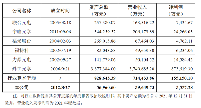 在招股书中,中润光学列出了联合光电(300691.SZ)、福光股份(688010.SH)、宇瞳光学(300790.SZ)、福特科、力鼎光电(605118.SH)和舜宇光学科技(2382.HK)作为可比公司。