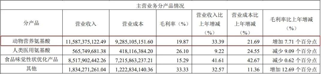 根据2021年财报显示,动物营养氨基酸(赖、苏氨酸为主)是梅花生物目前最核心的产品,贡献了50.74%的收入和52.14%的利润,毛利率为19.87%,其次才是食品味觉性状优化产品(味精、呈味核苷酸二钠为主)。