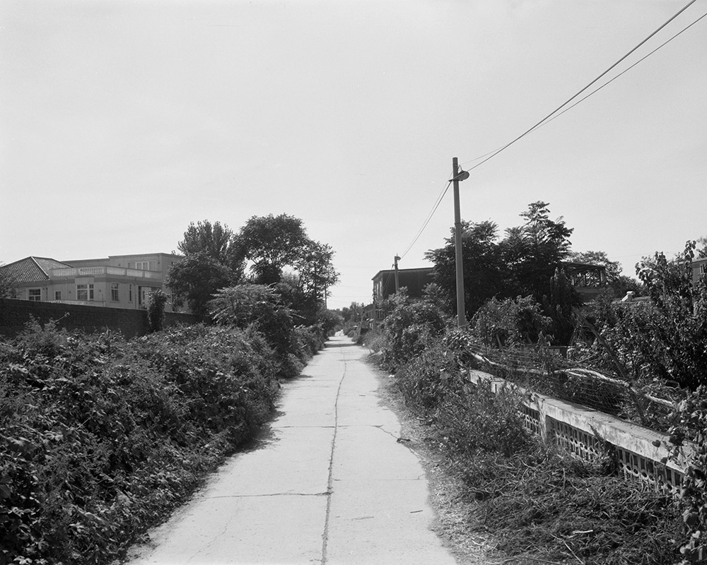 这些村子仿佛是被抛弃的。对于我这样一个偶然误入此地,想随便拍点儿什么的陌生人来说,根本不在意这条路通往哪儿,反正大概就是通往又一个别墅区。我在意的,是右边这一小段似曾相识的白色矮墙,这老旧的样式,似乎勾起了一点儿什么童年的记忆,在烈日之下。