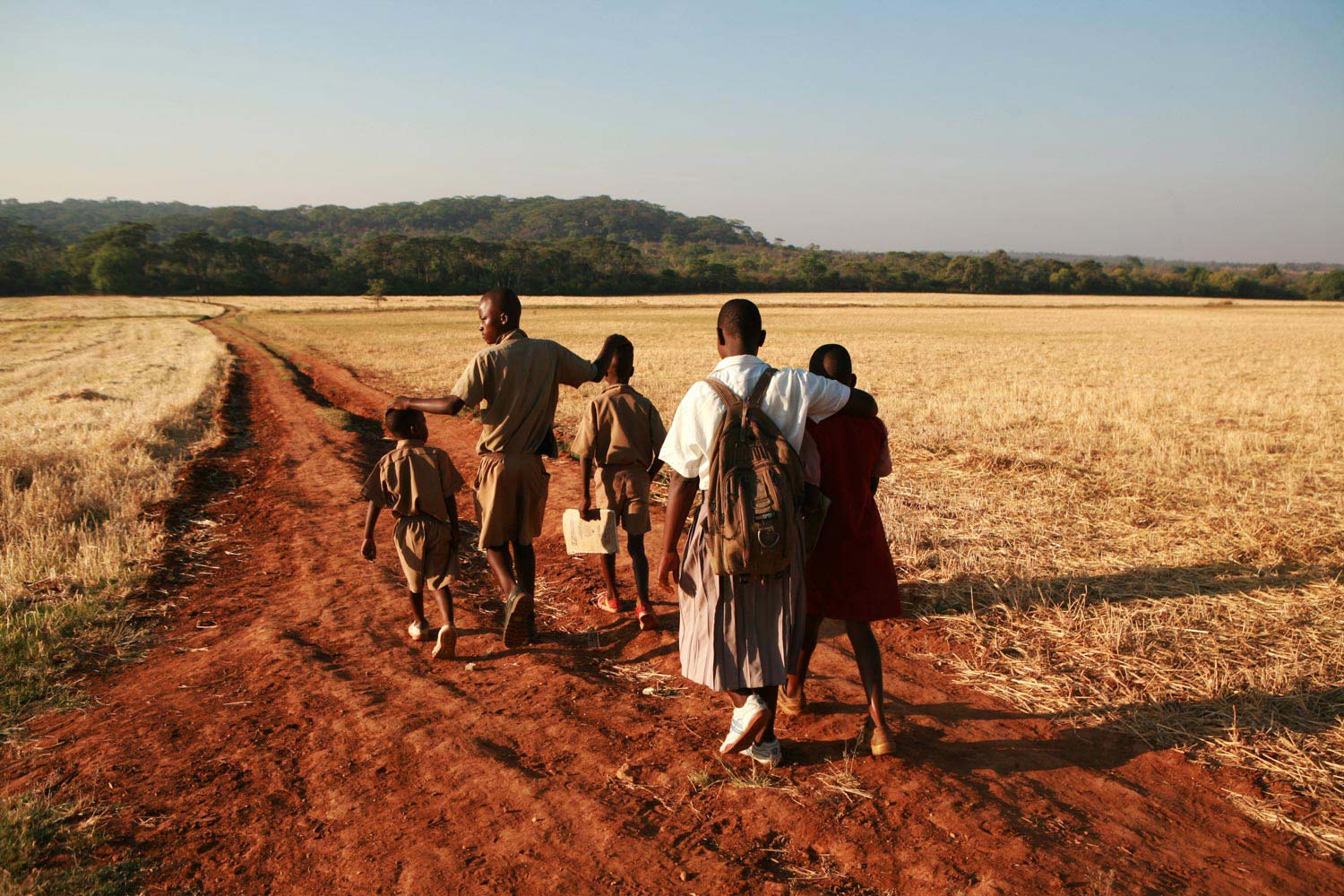 清晨,津巴布韦。奇卡扎扎先生的几个孩子与我在路口告别。红色的铁矾土路穿过农场的庄稼地,把孩子们引向一片穆萨萨树林以及隐藏在树林底下的一条河流。趟过河流,孩子们还需走上两个小时才能到达一所山坳里的学校,中间还会经过一个艾滋病村。